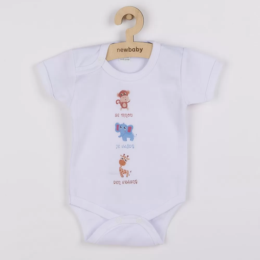 Originálne bavlnené dojčenské body s krátkym rukávom New Baby s nápisom So Mnou Je Každý Deň Krásny a obrázkom. Farby použité na potlač sú certifikované a vhodné pre bábätká. Je vyrobené z príjemného a kvalitného materiálu, v ktorom sa bude Vaše bábätko cítiť príjemne. Body má zapínanie na cvočky na ramienku a medzi nožičkami, čo uľahčuje obliekanie a prebaľovanie. Doprajte Vášmu bábätku vyniknúť v originálnom bode. Zloženie: 100% bavlna.