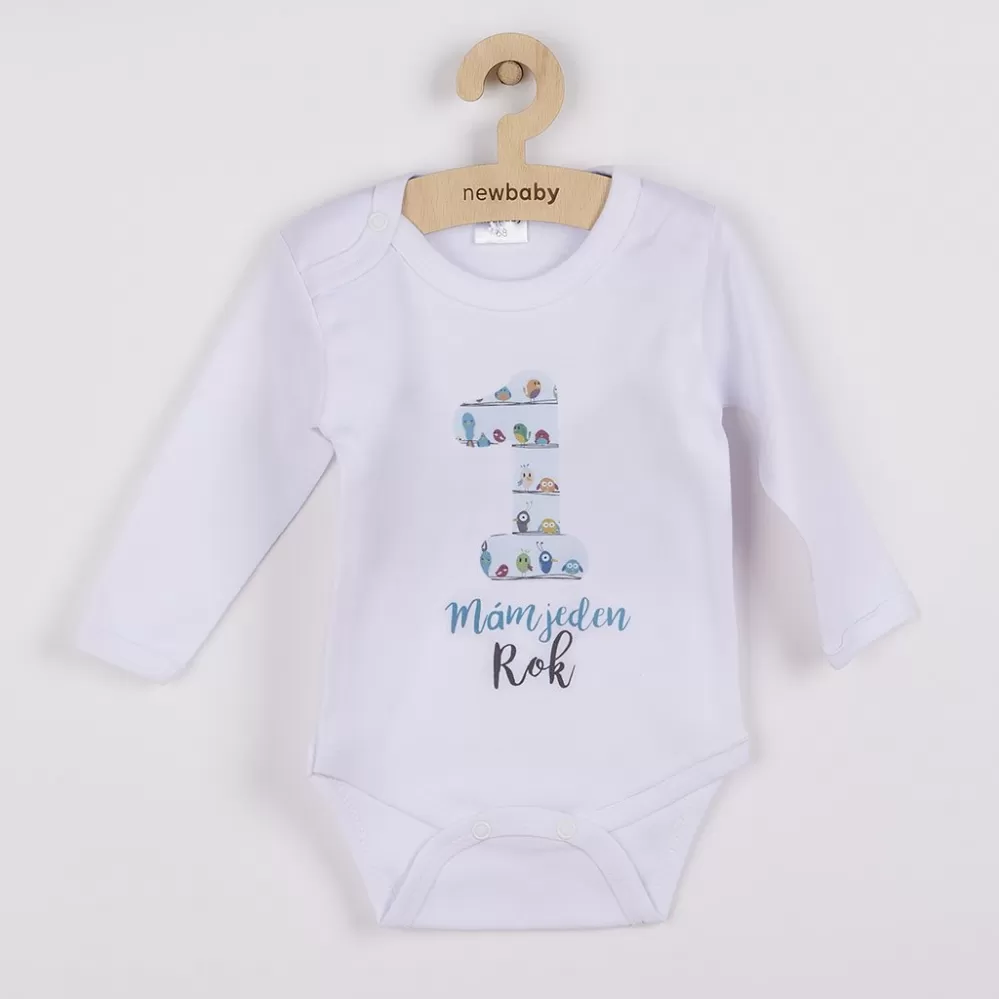 Originálne bavlnené dojčenské body s dlhým rukávom New Baby, s krásnym obrázkom veľkej jednotky a nápisom Mám jeden Rok. Farby použité na potlač sú… Celý popis