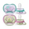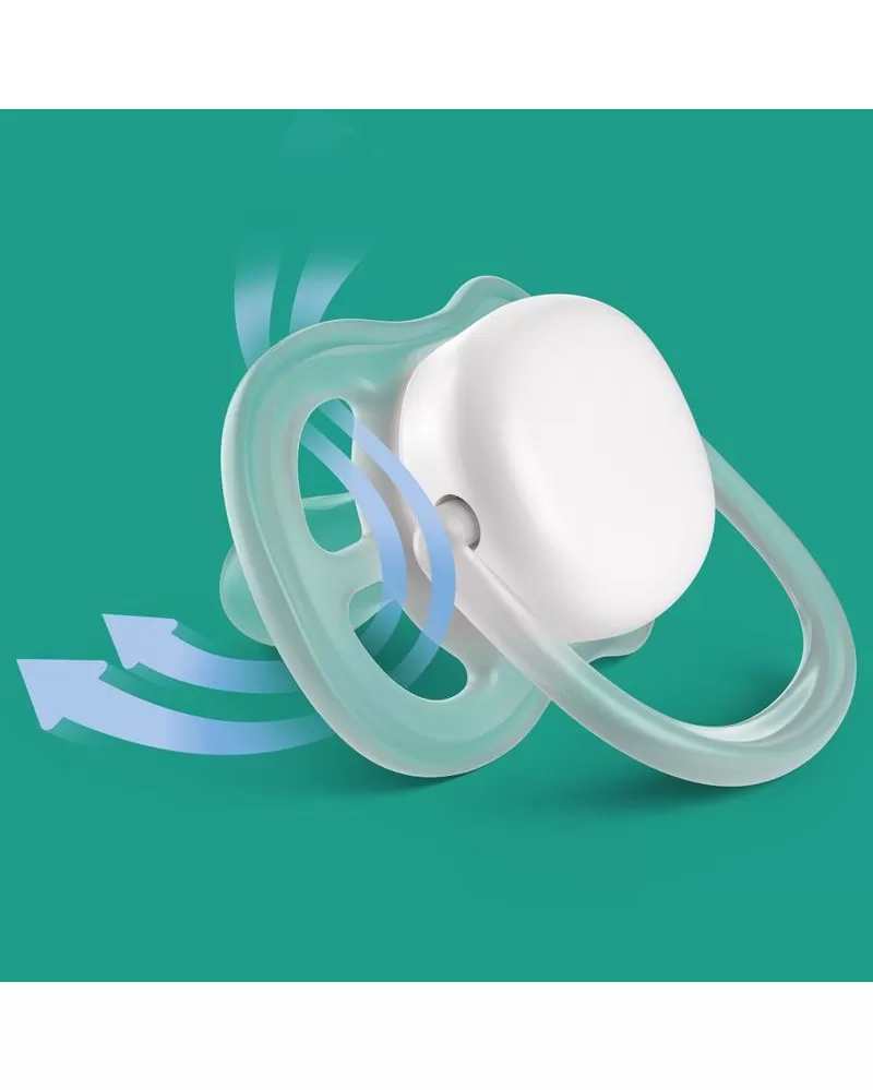 Umožňuje pokožke vášho dieťatka dýchať. Mimoriadne veľké vzduchové otvory umožňujú pohodlnejšie upokojenie. Upokojuje a poskytuje dostatok vzduchu. Cumlík Philips Avent Ultra Air je vybavený mimoriadne veľkými vzduchovými otvormi, ktoré udržia pokožku dieťaťa v suchu. K dispozícii v rôznych farbách a prevedeniach. Možnosť sterilizácie a uloženia v praktickom puzdre Pohodlná sterilizácia za 3 minúty. Vlastnosti: - Upokojenie vďaka zvýšenému prúdu vzduchu - Umožňuje detskej pokožke dýchať - Pohodlný násoska z jemného a mäkkého materiálu - Bábätko sa cíti prirodzene - 98% úspešnosť prijatia cumlíka* - Cumlík je vyrobený zo 100% silikónu vhodného pre styk s potravinami - Prirodzený vývoj ústnej dutiny - Kvalita zaručená - Navrhnuté a vyrobené v Holandsku Umožňuje detskej pokožke dýchať Vďaka veľkým otvorom môže detská pokožka dýchať, takže pri upokojovaní zostáva suchšia. 98% úspešnosť prijatia cumlíka* Keď sme sa rodičov opýtali, ako ich deti na náš silikónový cumlík s textúrovanou povrchovou úpravou reagujú, v priemere 98% z nich odpovedalo, že ich bábätko cumlíky Philips Avent Ultra Soft a Ultra Air prijíma. Cumlík je vyrobený zo 100% silikónu Cumlíky Ultra Soft a Ultra Air vyrábame zo silikónu, pretože sa jedná o bezpečný a inertný materiál, široko využívaný na lekárske účely, neobsahuje nebezpečné chemikálie, hormonálne aktívne látky (napr. BPA) ani alergény. Ortodontický cumlík Naše ortodontické, symetrické, mäkké silikónové cumlíky sú navrhnuté tak, aby podporovali prirodzený vývoj ústnej dutiny. Bábätko sa cíti prirodzene Náš textúrovaný silikónový cumlík je navrhnutý tak, aby dieťaťu pripomínal mamičkin prsník. Sterilizuje za 3 minúty Cestovné puzdro dodávané so cumlíky Ultra Soft a Ultra Air, slúži aj ako sterilizátor. Stačí pridať trochu vody a vložiť ho do mikrovlnnej rúry. Môžete byť pokojní, cumlík bude pred ďalším použitím čistý. Vyrobené v Holandsku Naše cumlíky Ultra Soft a Ultra Air sú navrhnuté a vyrobené v Holandsku.