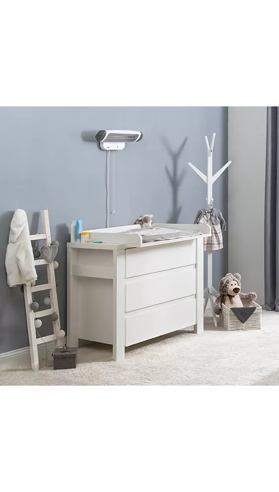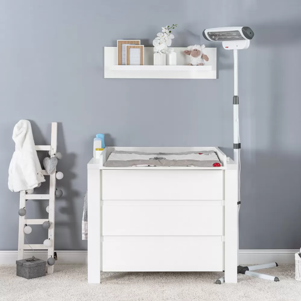 Díky základně lze zářič postavit kdekoli v místnosti. Přiložená montážní deska umožňuje pohodlnou montáž na stěnu nad přebalovacím pultem.