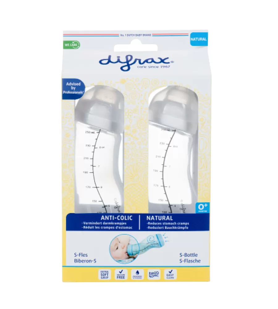 Ušetrite a kúpte si zvýhodnenú sadu dvoch dojčenských S-fľaštičiek Difrax 250 ml, ktoré sú už mnoho rokov prvou voľbou bábätiek, mamičiek i oteckov. Esíčkovitý tvar a antikolikový ventil na dne fľaštičky spoločne zaručujú bábätku bezpečný príjem potravy bez primiešaného vzduchu. Môžete ju používať hneď od narodenia bábätka a osvedčuje sa aj v kombinácii s dojčením. Neskôr je tiež vhodná na podávanie kašičiek a hustejšej stravy. Zamedzuje tak žalúdočným kŕčom, grganiu a zvracaniu. S-fľaštička Difrax je prvá svojho druhu, ktorá bábätku aj rodičom zaisťuje kŕmenie v prirodzenej polohe, rovnaké ako pri dojčení. V sade sú dve fľaštičky, každá v inej farbe. Pred každým použitím skontrolujte, či sú prieduchy v antikolikovom ventile čisté, a teda priechodné.