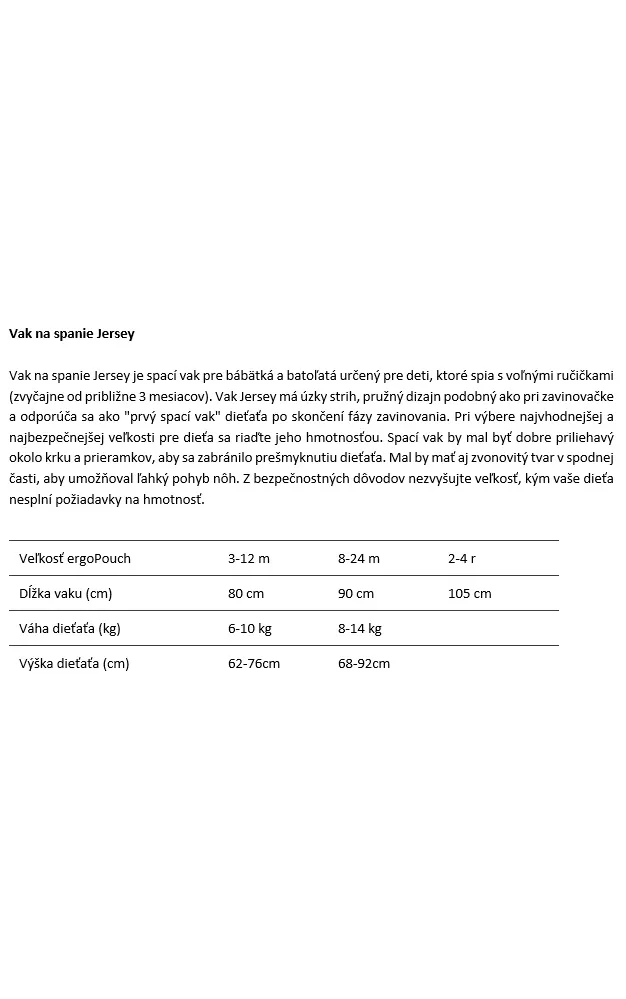 Vak na spaní pro miminka a batolata určený pro děti, obvykle od přibližně 3 měsíců. Vak na spaní Jersey má úzký střih, pružný design podobný jako u zavinovačky a doporučuje se jako „první spací pytel“ dítěte po skončení fáze zavinování. Design schválený pro bezpečný spánek je vyroben z měkké, elastické organické bavlny s certifikátem GOTS, která je netoxická a šetrná k pokožce dítěte. Ergonomicky navržený vak má zvonovou spodní část, která podporuje zdravý vývoj kyčlí a je schválena Mezinárodním institutem pro dysplazi kyčlí a materiál je elastický, aby se dítě mohlo během spánku volněji pohybovat a zůstat v pohodlí.