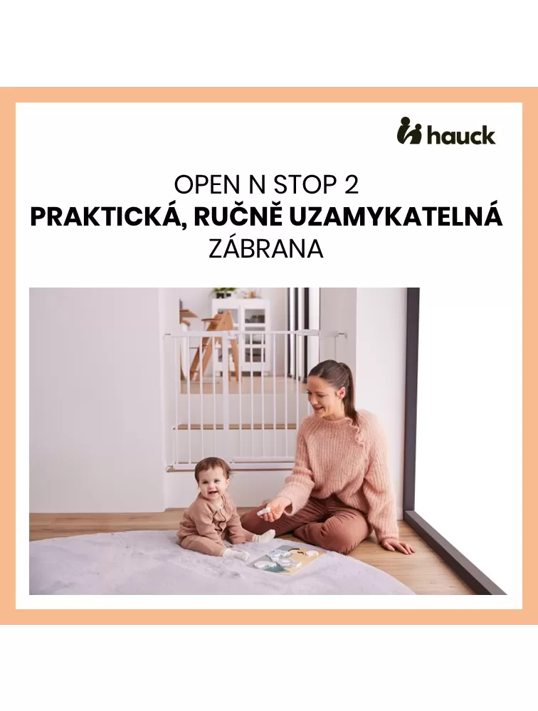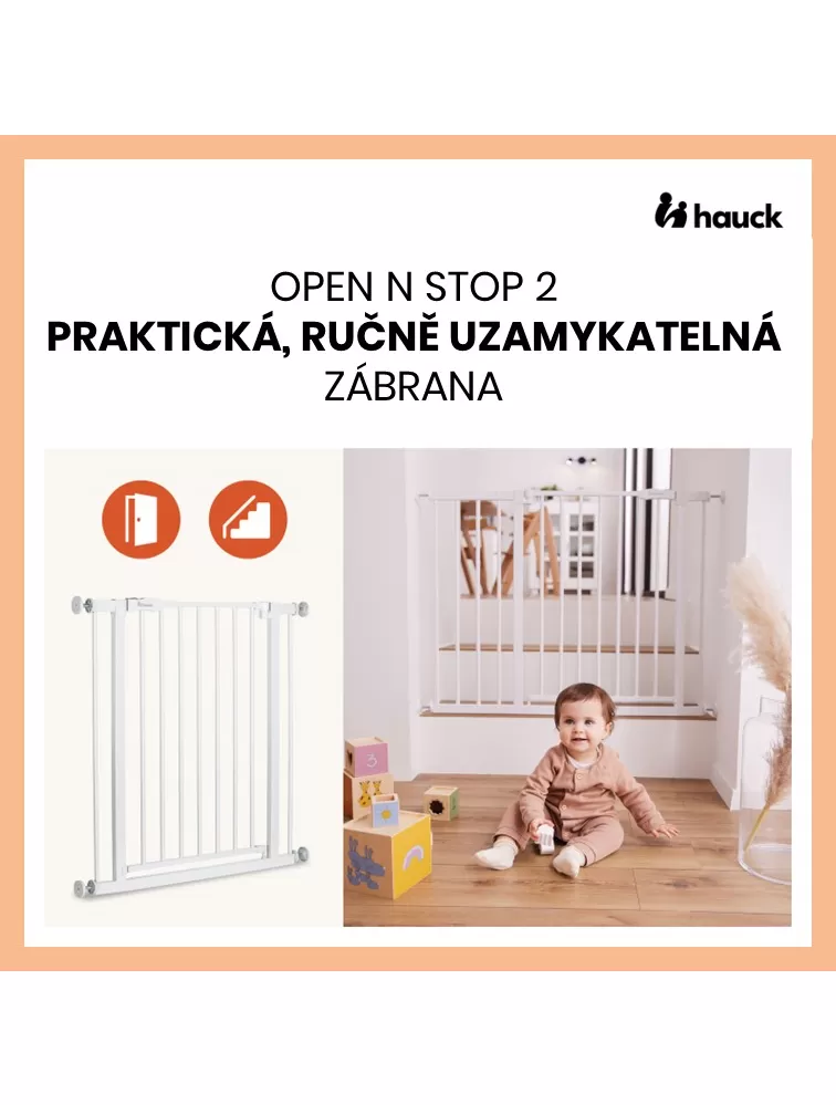 Zábrana Open N Stop 2 je vhodná nielen pre rámy so štandardnou šírkou 75-80 cm, ale je možné si vybrať aj z ponuky zábran s rozšírením o 9 cm alebo o 21 cm. Zábranu je tiež možné upevniť na okrúhle zábradlie pomocou samostatných hauck Y-adaptérov (upínacích skrutiek).