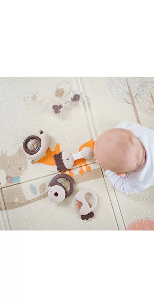 Hrkálka v roztomilom dizajne je ideálna pre rozvoj zmyslov dieťatka. Je vyrobená z bezpečných materiálov a je k dispozícii v ergonomickom tvare, ktorý dokonale padne do malých ručičiek. Zvuky vydávané hrkálkou stimulujú sluch, zatiaľ čo kontrastné farby pomáhajú dieťaťu rozvíjať zrak od prvých mesiacov života. Praktické a bezpečné: - Dieťa ju môže pohodlne držať vo svojich malých ručičkách. Je vyrobená z bezpečných a odolných materiálov bez ostrých hrán. Stimulujúce zvuky - Po zatrasení hrkálka vydáva jemné zvuky, ktoré priťahujú pozornosť dieťatka a rozvíjajú jeho sluch. Rozvoj motorických zručností - Pohybovanie hrkálkou podporuje motorické zručnosti dieťatka a pomáha mu precvičovať úchop a manipuláciu s predmetmi. Odporúčaný vek: 3 mesiace+ Rozmery hrkálky: 5 x 13,5 cm