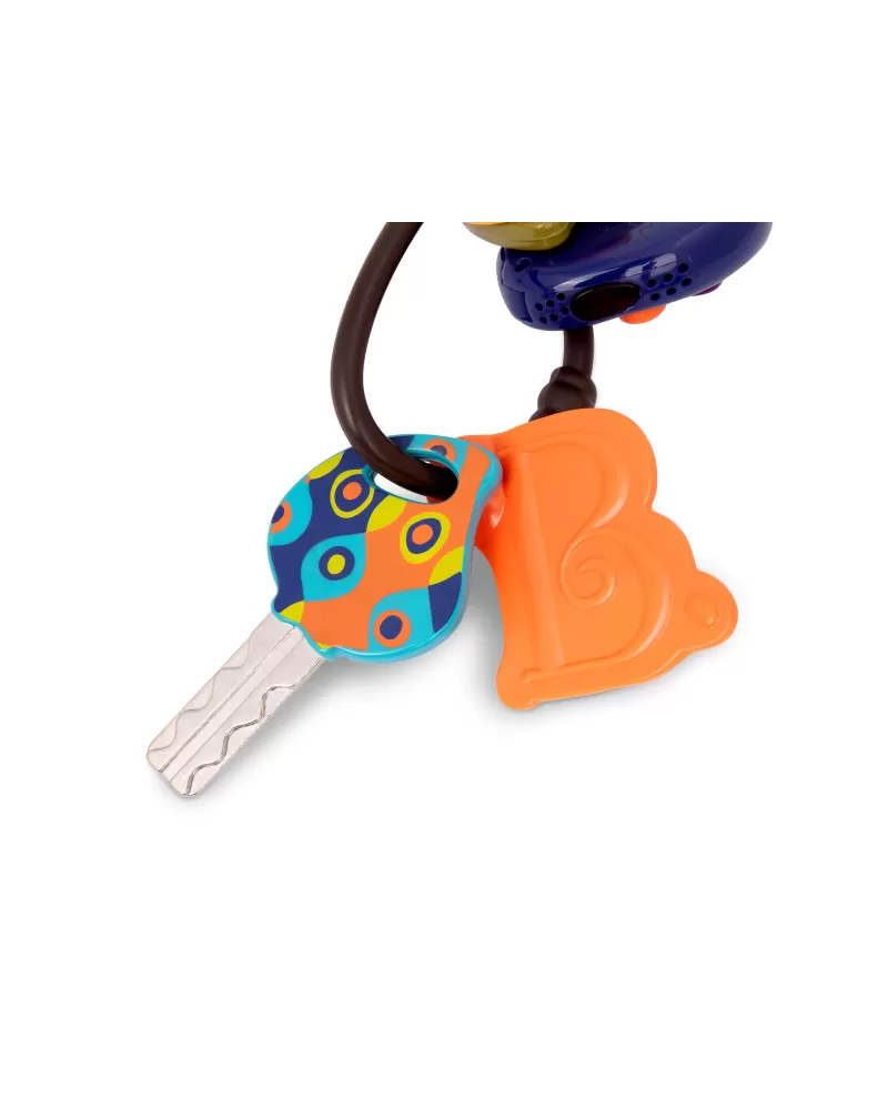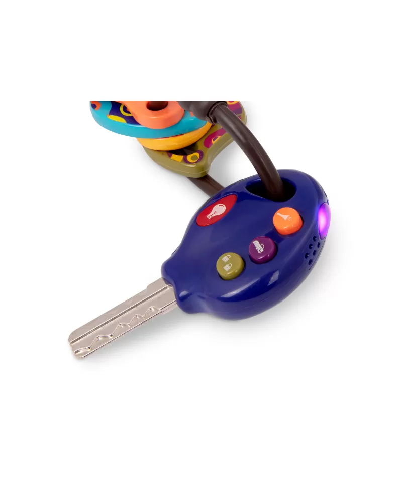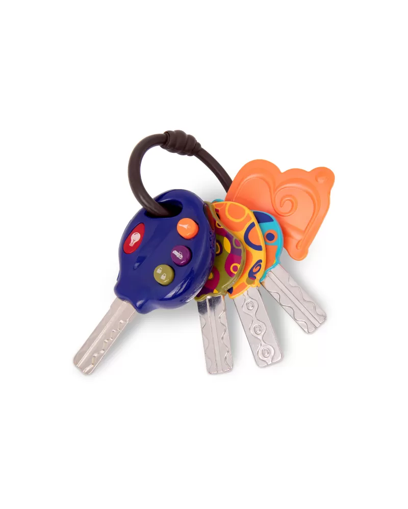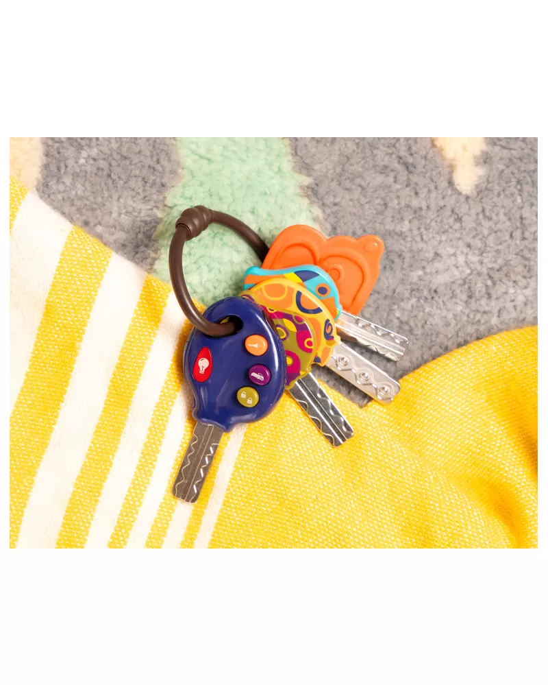 Štyri klíčky ako od ozajstného auta na krúžku s príveskom. Jeden z klíčkov má ovládač s tromi rôznymi zvukmi a svetielkom. Odolný materiál bezpečný na skúmanie rúk i ústy.