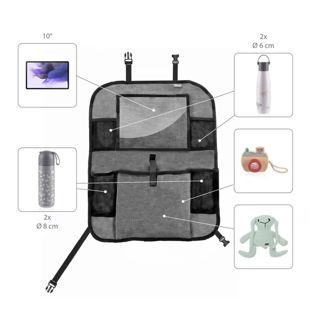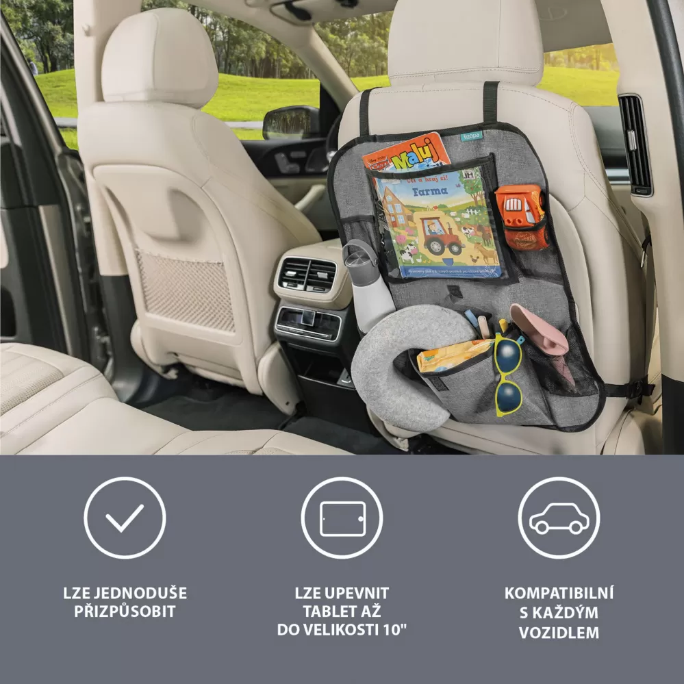 Praktický organizér na sedadlo s vreckom na tablet je perfektný spoločník na každú cestu s deťmi.