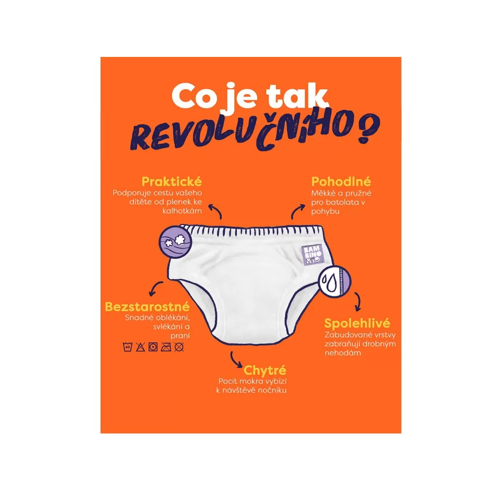 Priepustná vrstva spolu s absorpčnou vrstvou čiastočne chráni pred znečistením. Pomáhajú urýchliť proces učenia sa na nočníku, ale nenahrádzajú plienky. Môžete im dať dieťa ako darček. Dávajú dieťaťu pocit, že už vyrastali a nepotrebujú plienky. Nepoužívajte ich skôr, ako je dieťa pripravené prekročiť nočník. Učebná plienka obsahuje absopujúcu vrstvu, ktorá zachytáva menšie množstvo moču, ale nenahrádza plnú viacvrstvovú plienku nohavičkami. Sú navrhnuté pre dieťa, ktoré už prechádza do nočníka a občas sa stáva nepríjemným incidentom. Pri učení sa nohavičiek na plienky sa vlhkosť okamžite cíti, dokáže si to uvedomiť a sedieť na nočník. Nedávajte nohavičky učiacich sa plienok na noc alebo na spanie, a ak nemáte inú možnosť umiestniť inú plienku s viacerými hráčmi Bambino MIO, ktorá dopĺňa absorpčnú kapacitu. Pred použitím učenia plienky predstavte najmenej dvakrát dvakrát.