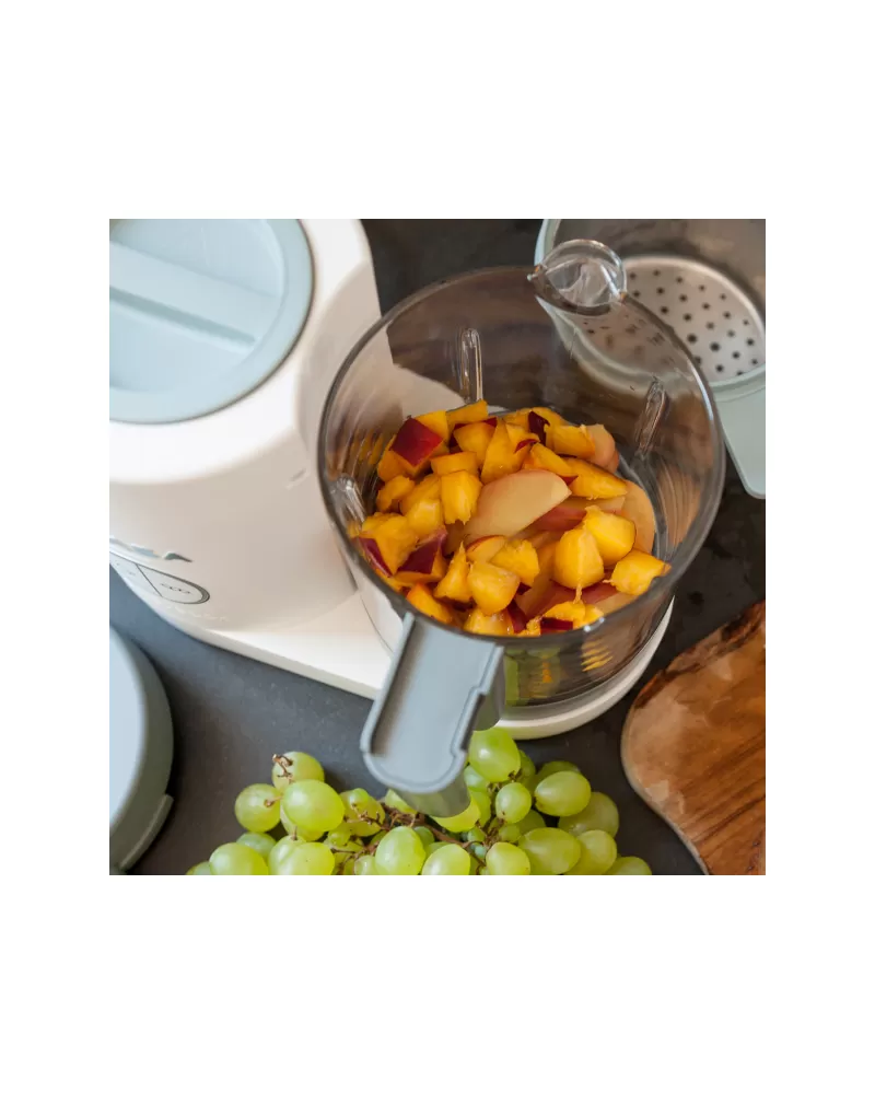 Ak chcete následne pokrm rozmixovať, iba vysypete uvarené suroviny z vkladacieho košíka do priehľadnej hlavnej nádoby a rozmixujete (podľa veku dieťaťa na jemnú hladkú kašu, alebo na hrubšiu štruktúru s kúskami). Keď sa dieťa naučí dobre hrýzť, dá sa Babycook® ďalej používať na zdravé varenie v pare aj bez mixovania.