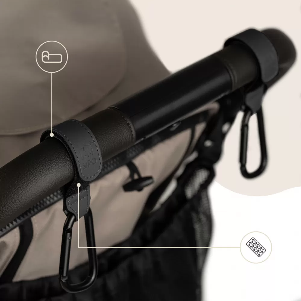 Háčky SIPO jsou určeny k připevnění různých zavazadel na madlo kočárku. Jsou ideální pro každodenní procházky, nákupy, cestování nebo návštěvy u lékaře. Hodí se také pro použití na invalidním vozíku, jízdním kole, nákupním vozíku, ne elektrickém skútru nebo jako cestovní háčky.