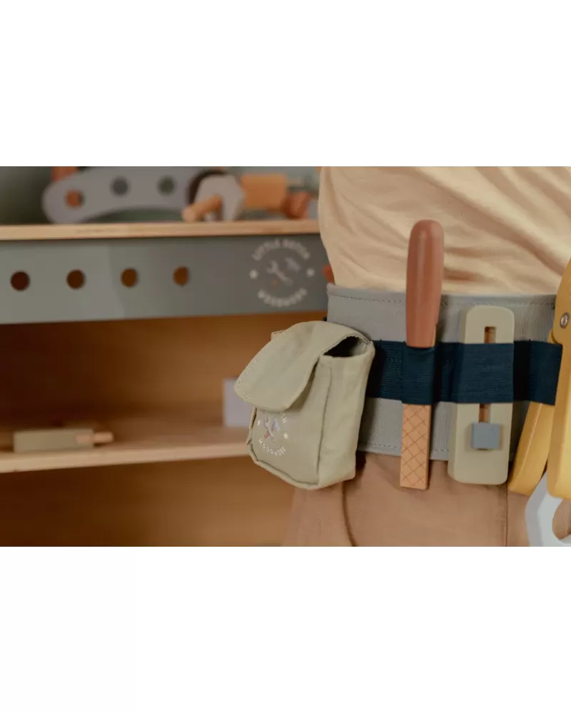 Vďaka páske s kľučkami nástroja bude mať váš malý opravár vždy všetky svoje nástroje. Jeho priestor na pásovi má meter, kliešte, škatule pre políčka, pílu a súbor.