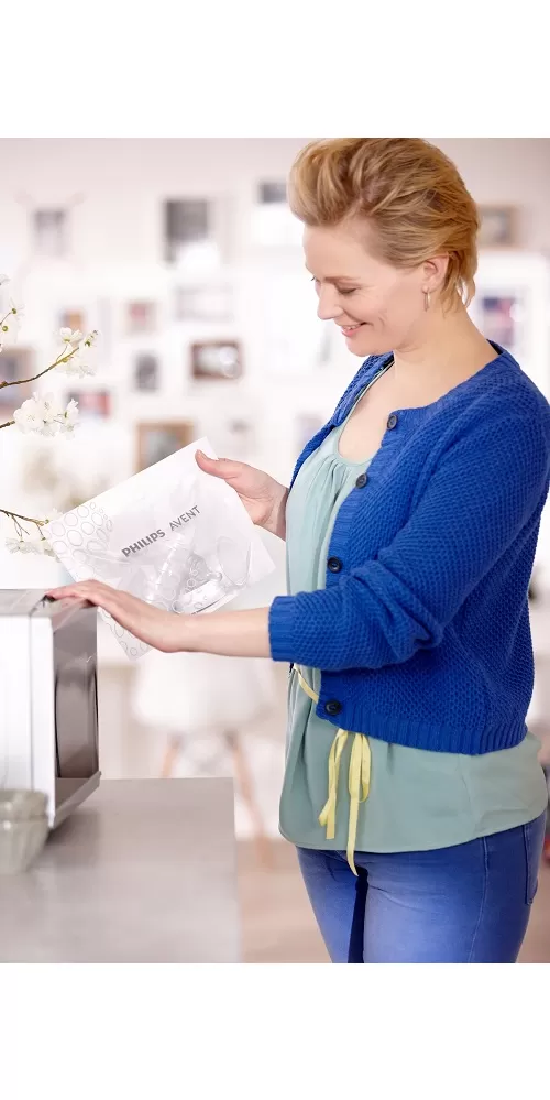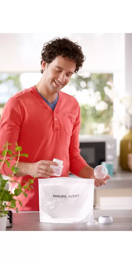 Parné sterilizačné vrecká Philips Avent do mikrovlnnej rúry predstavujú rýchly, jednoduchý a efektívny spôsob, ako zabezpečiť, aby ste mali vždy sterilné dojčenské fľaše a výrobky, nech ste kdekoľvek. S každým vreckom je možné fľaše sterilizovať v mikrovlnnej rúre len za 90 sekúnd.