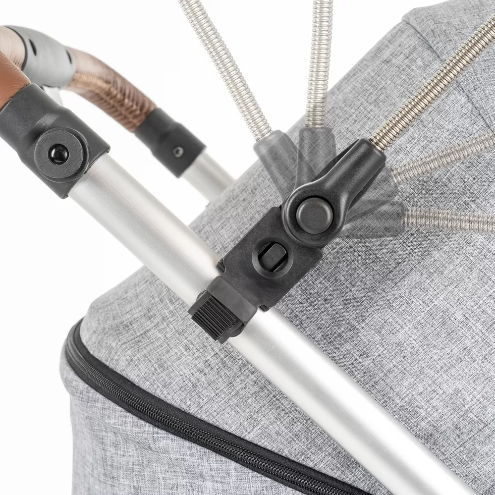 Univerzálny držiak sa prispôsobí šírke rámu akéhokoľvek kočíka. Slnečník je možné bezpečne pripevniť na konštrukcie s okrúhlym aj oválnym profilom a to ako na rukoväť, tak aj na predné madlo alebo napríklad priamo na rám kočíka.