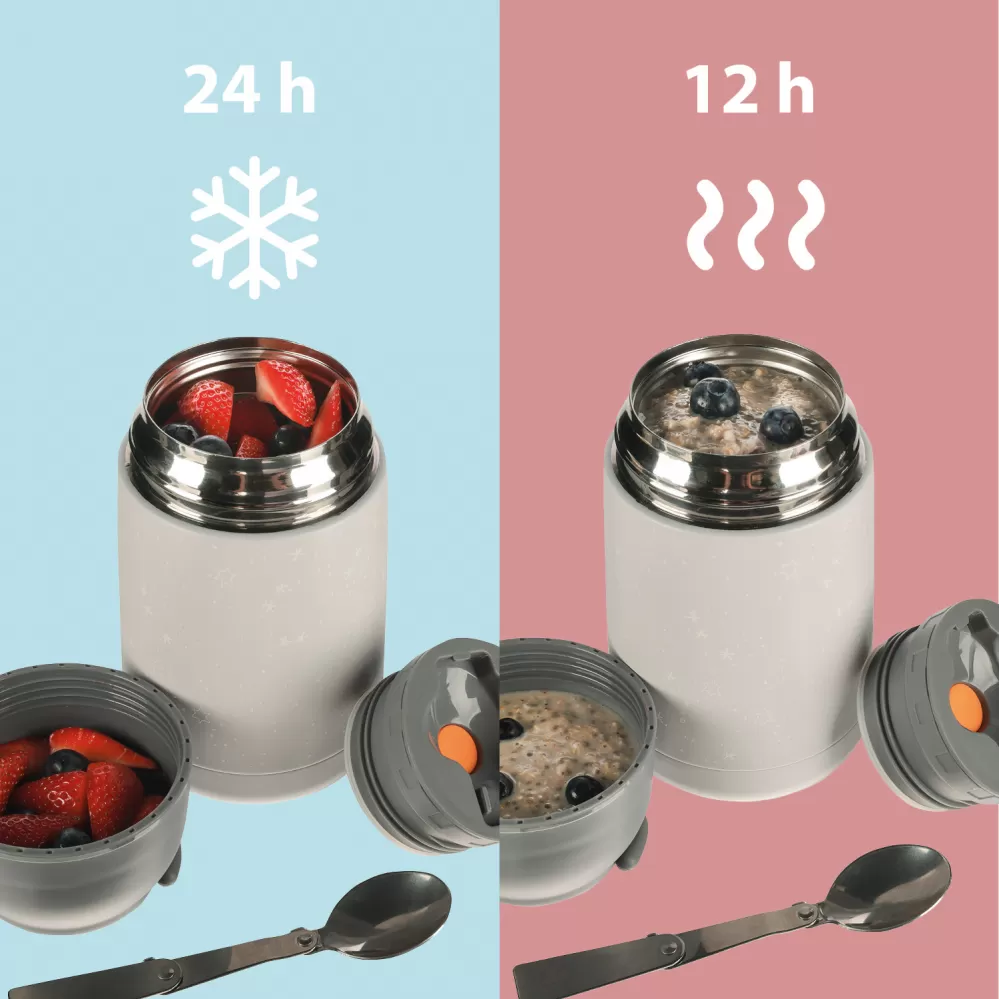 Súčasťou je múdra skladacia lyžička, ktorá skvele pasuje do uzáveru a dieťa si tak môžete dopriať teplú kašu alebo polievku kdekoľvek. Viečko termosky je možné použiť ako hrnček či misku. Vrchný uzáver je opatrený bezpečnostným ventilom, ten uvoľní nadbytočný vzduch tvoriaci tlak. Vďaka uvoľneniu stlačeného vzduchu je možné nádobu ľahko otvoriť a predchádza sa prípadnému obareniu parou.