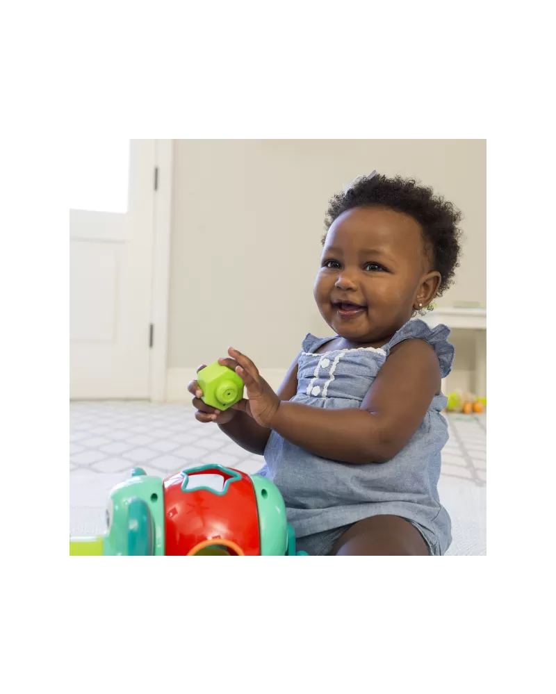 Roztomilý slon s rôznofarebnými vkladacími tvarmi. Pohyblivé uši a chobot aj otočné telo slona budú lákať dieťa na skúmanie.
