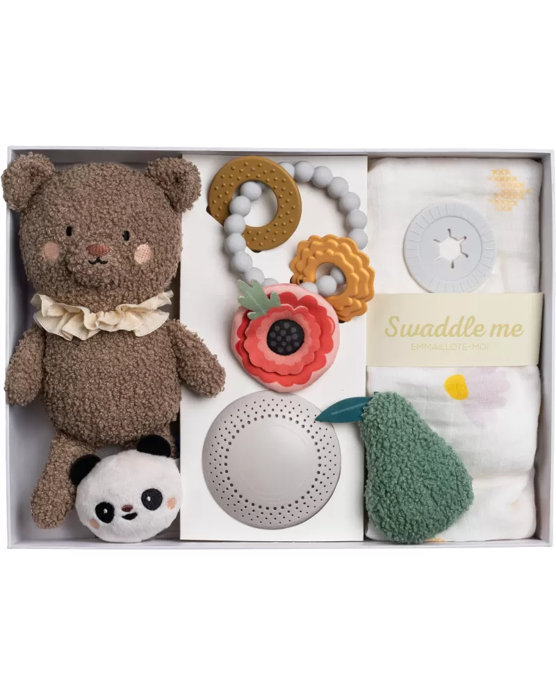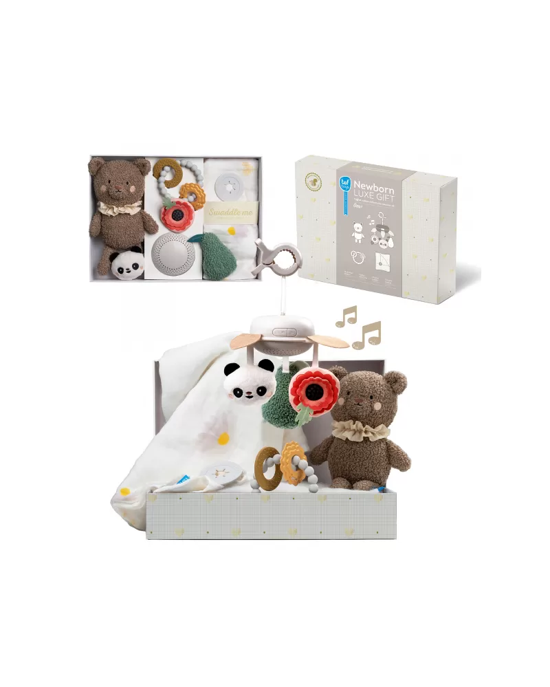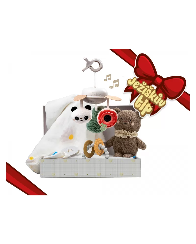 Luxusný darčekový box pre pokojné zaspanie obsahuje hudobný kolotoč s upokojujúcimi melódiami, mäkký medvedík, mäkký silikónový bit a textilnú plienku. Textilná plienka s originálnym silikónovým tlačidlom je možné použiť na zábal a ako posteľ na diskrétne dojčenie.