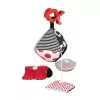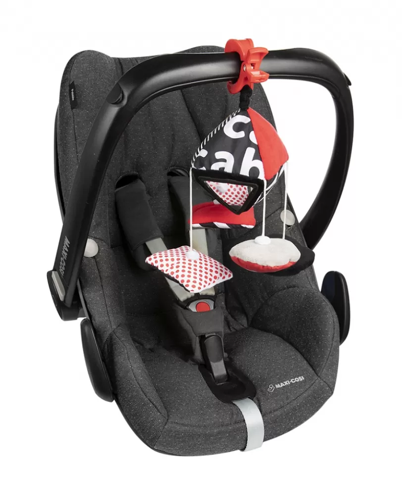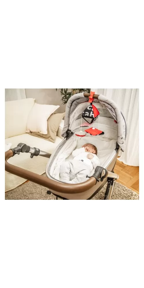 Kontrastná závesná hračka s klipom SENSORY. Hračku je možné pomocou klipu pripevniť na požadované miesto – kočík, postieľku alebo autosedačku. Praktický doplnok disponuje šuštiacimi a zvoniacimi elementmi, zrkadlom, hrkálkou a odnímateľnými plyšovými prvkami. Senzorické farby stimulujú rozvoj zmyslov dieťaťa. O kolekcii SENSORY: Senzorická kolekcia hračiek bola vyvinutá pre deti do jedného roka. Počas tohto obdobia dochádza k najvýznamnejším zmenám v psychomotorickom vývoji dieťaťa. Senzorické hračky sú reakciou na aktuálny trend na trhu, ktorý sa zameriava na podporu rozvoja prostredníctvom zábavy, keď rodič spolu s dieťaťom môže stimulovať rozvoj zraku, precvičovať schopnosť sústrediť pozornosť na objekt, zameriavať a nasledovať objekty očami alebo precvičovať obratnosť a koordináciu. Prečo sú senzorické hračky také dôležité? Zrak dieťaťa je po narodení najmenej rozvinutým zmyslom. Tma, ktorá prevláda v maternici, nedovoľuje, aby sa zrak v prenatálnom období plne rozvinul. Po narodení je zrak dieťaťa rozmazaný a hmlistý. Dieťa vidí iba obrysy v rozmedzí 20-30 cm, veľké tvary a prvky z prostredia. Asi po mesiaci začne vidieť farby, spočiatku červené a čierne. Asi za tri mesiace si začne všímať ďalšie výrazné farby. Približne vo veku šiestich mesiacov začína vidieť detaily na obrázkoch a tiež vidí oveľa jasnejšie. V dvanástom mesiaci života je už zrak dieťaťa plne vyvinutý ako u dospelého a stáva sa skvelým nástrojom na objavovanie sveta. Senzorické hračky z novej kolekcie SENSORY tak pomáhajú stimulovať zrak dieťaťa a trénujú schopnosť sústrediť pozornosť už od prvých týždňov života.