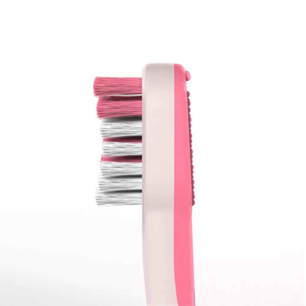 - Kartáček má měkké štětinky, které jsou šetrné k citlivým a podrážděným dásním při prořezávání zoubků. Barevné označení na štětinkách pomáhá rodičům snadno dávkovat správné množství zubní pasty.
